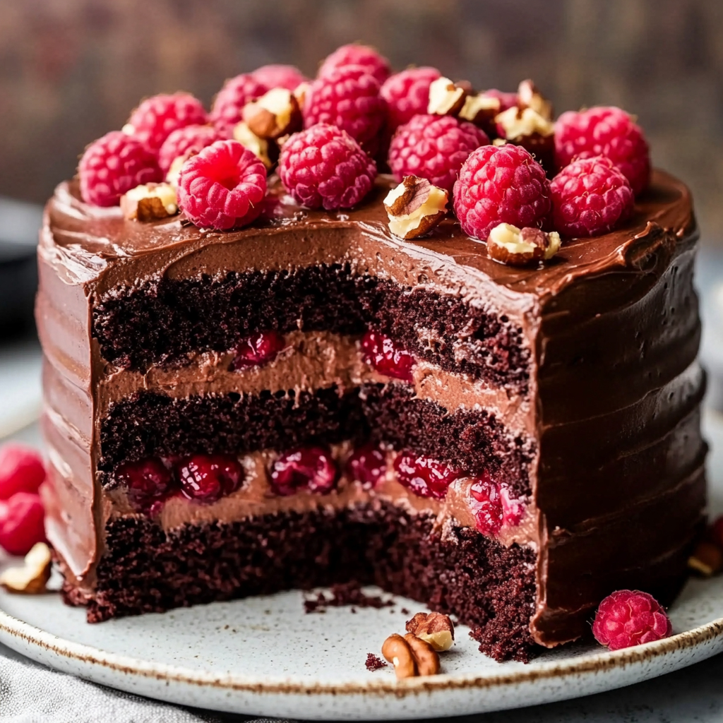 A must-try recipe for an extra moist chocolate cake layered with fresh raspberries and roasted hazelnuts, topped with a fluffy ganache.