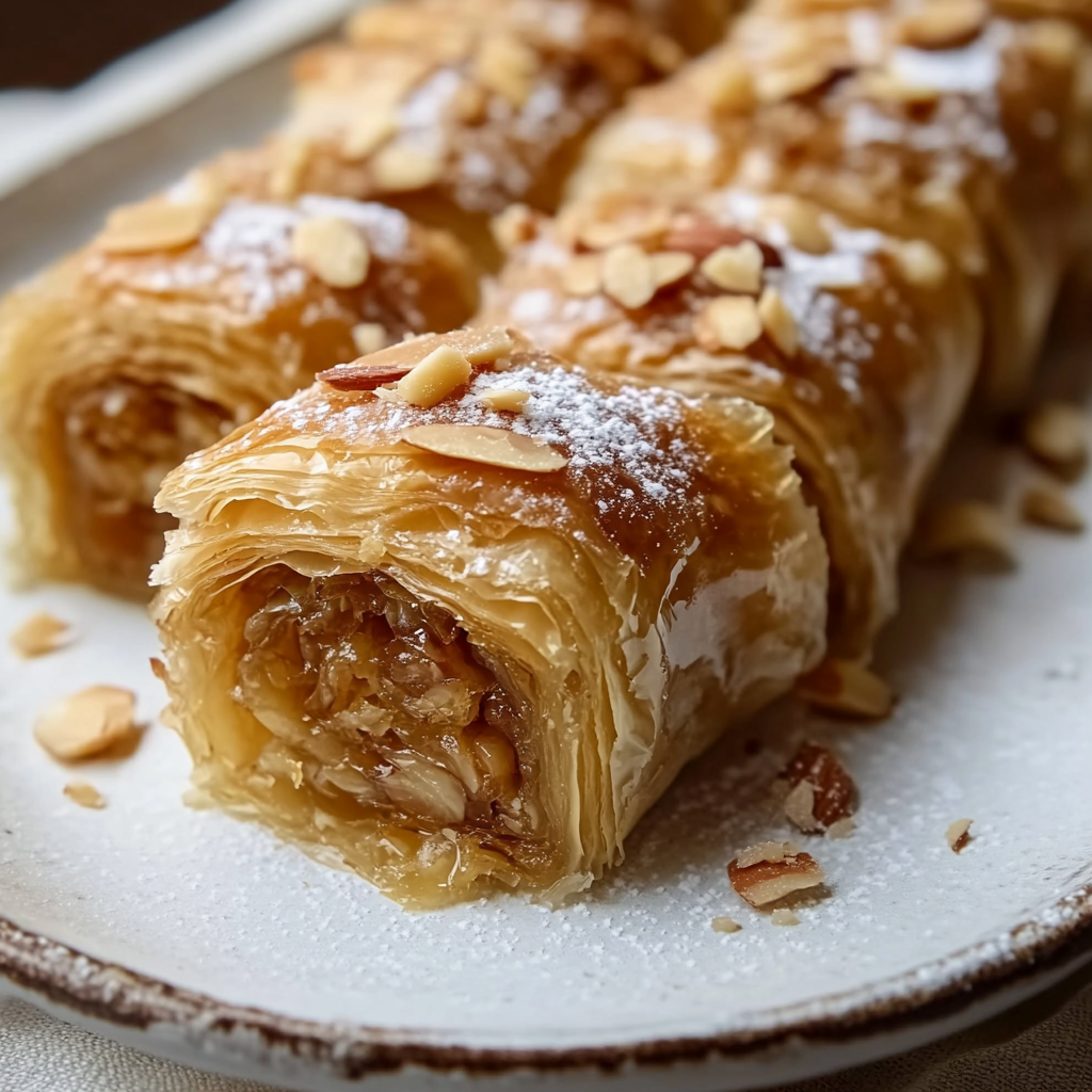 A delightful recipe for Honey Almond Baklava Rolls, combining flaky phyllo pastry with a sweet almond filling and a honey syrup.
