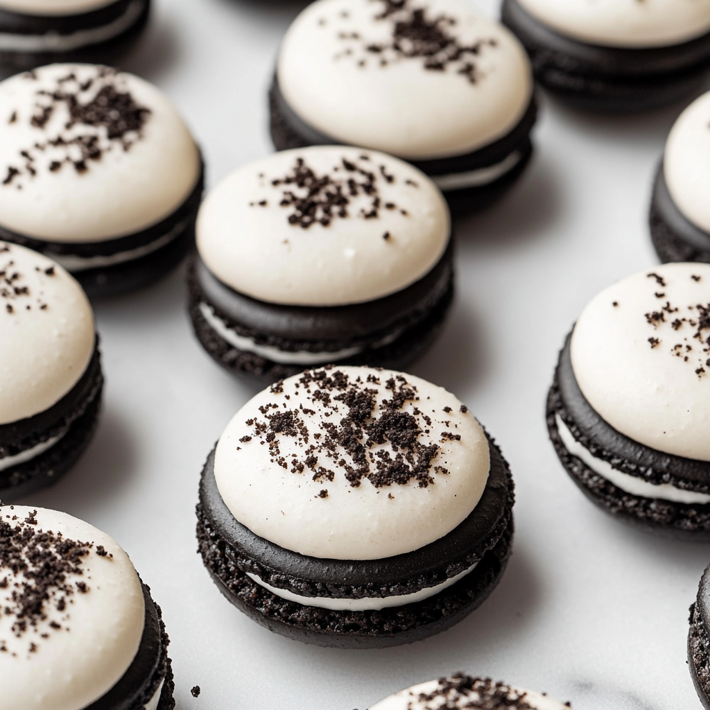 Delicious Oreo macarons filled with a creamy vanilla filling that will impress your guests.