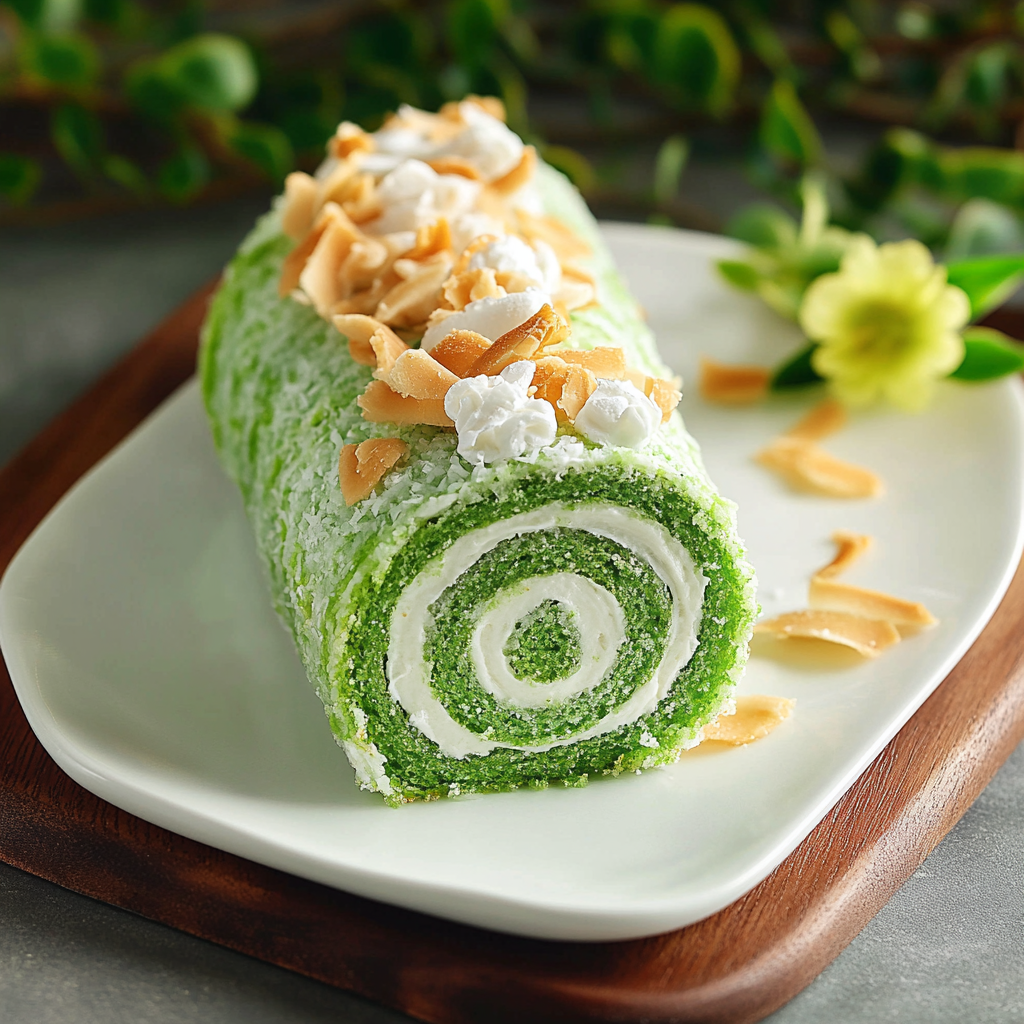 A delightful recipe for a Tropical Pandan Coconut Swiss Roll, featuring a light and fluffy cake filled with whipped cream and shredded coconut.